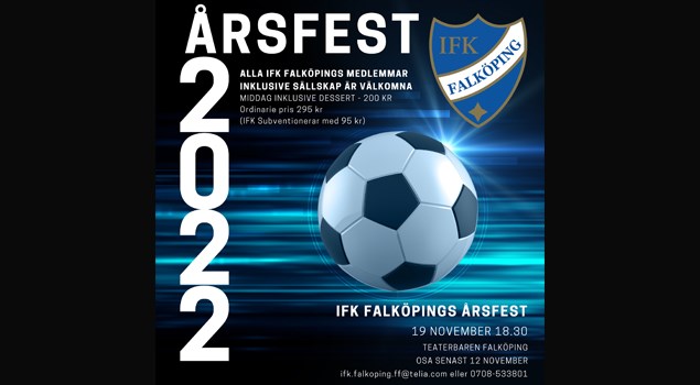 Den 19 november klockan 18.30 är det dags för IFK Falköpings årsfest. Festen och middagen är på Teaterbaren och det kostar 200 kr för mat och kaffe med dessert. (IFK har subventionerat med 95 kr) OBS - om ni vill ha ett vegetariskt alternativ eller specialkost meddela detta när ni anmäler er. Anmälan här: ifk.falkoping.ff@telia.com eller via telefon 0708-533801 samtidigt som ni swishar in på : 123 571 66 91 Anmälan är bindande. OSA senast 12 november. Alla medlemmar i IFK inklusive respektive är välkomna denna kväll!