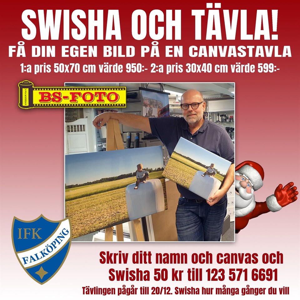 MISSA INTE CHANSEN ATT VINNA EN CANVASTAVLA - VÄRDE 950 KR! SWISHA OCH TÄVLA INNAN SÖNDAG KVÄLL 20/12 23.59 Swisha 50 kr innan midnatt den 20/12 så är du med och tävlar om en Canvastavla - Värde 950 kr från BS-Foto. Hur enkelt som helst - Swisha 50 kr till 123 571 66 91 och skriv ditt namn samt CANVAS i meddelanderutan så är du med i utlottningen. Du kan swisha 50 kr flera gånger och på det sättet ha ännu större chans att vinna detta fina pris samt även stötta IFK Falköpings verksamhet.