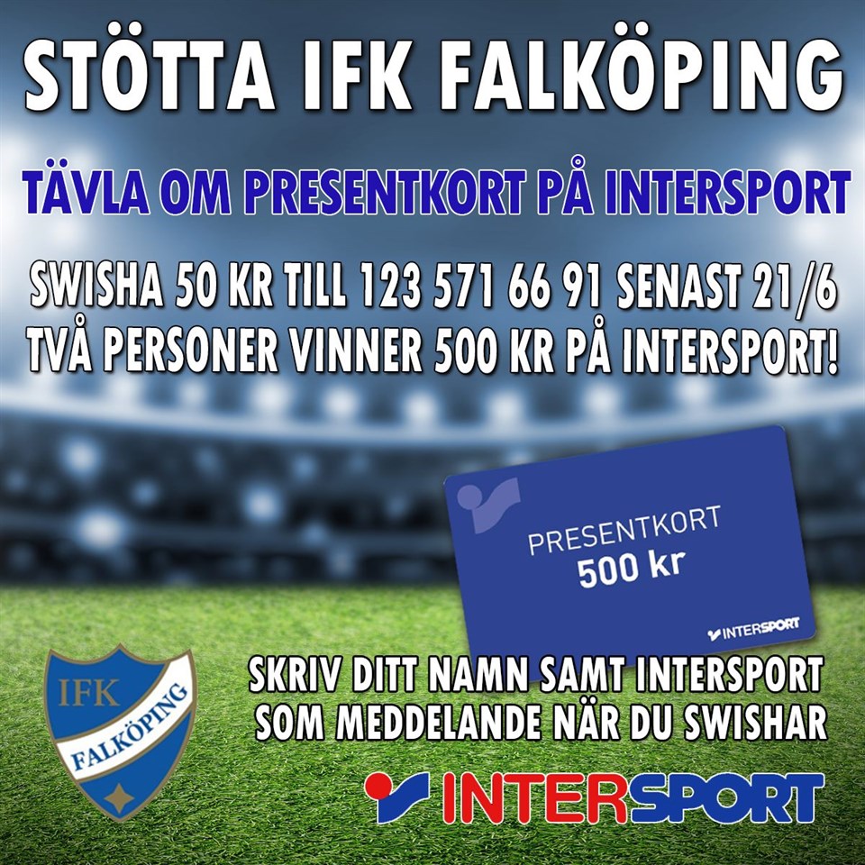 Swisha 50 kr till 123 571 66 91, skriv ditt namn samt Intersport i meddelanderutan så är du med och tävlar! Vi lottar ut två presentkort. Givetvis kan du swisha flera gånger för att ha större chans och även stötta IFK Falköping. Tävlingen pågår fram till den 21/6 klockan 23:59 och vinnarna presenteras onsdagen den 24 juni.