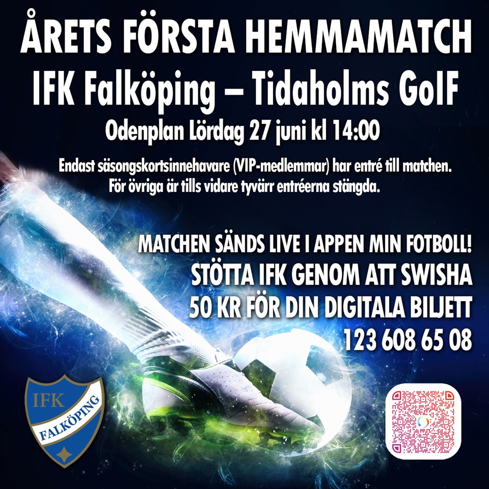 Nu äntligen är det dags för årets första seriematch på hemmaplan i helgen Vi tar emot Tidaholms GoIF på lördag 27 juni, matchstart kl 14:00 Entrén kommer endast vara öppen för säsongskortsinnehavare (VIP-medlemmar) då vi måste begränsa publiken till 50 st. Matchen kommer dock sändas via livestreaming i appen Min Fotboll, har du inte laddad ner den så är det nu du skall göra det. Passa även på och stötta föreningen via köp av en digital inträdesbiljett till matchen genom att swicha 50 kr till: 123 608 65 08 Följ denna länk för att följa vårt A-lag i Appen Min Fotboll