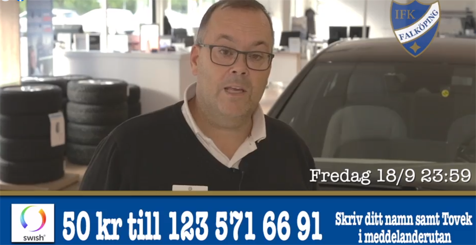 VINN EN REKONDITIONERING AV DIN BIL! Swisha 50 kr innan midnatt den 18/9 så är du med och tävlar om en rekonditionering av din bil. Hur enkelt som helst - Swisha 50 kr till 123 571 66 91 och skriv ditt namn samt Tovek i meddelanderutan så är du med i utlottningen. Du kan swisha 50 kr flera gånger och på det sättet ha ännu större chans att vinna detta fina pris samt även stötta IFK Falköpings verksamhet.