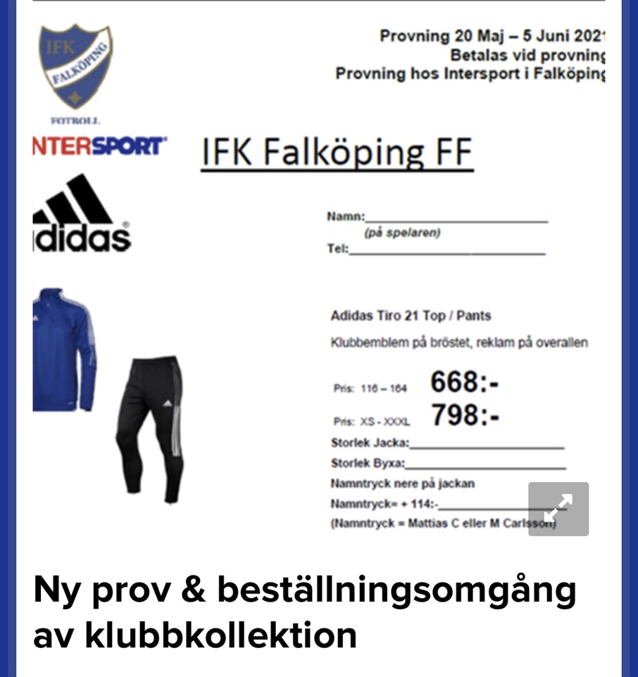 Med början 20:e maj fram till den 5:e juni kör vi en ny prov- och beställningsomgång av IFK:s klubbkollektion på Intersport. All betalning av beställda produkter görs till Intersport vid beställningstillfället. Nytt för 2021 är: • Ny modell på klubboverall som kommer vara under 2021-2022 • Väskor är Svarta i färgen i stället för blåa. (då Adidas inte har kvar den blå färg vi haft längre)