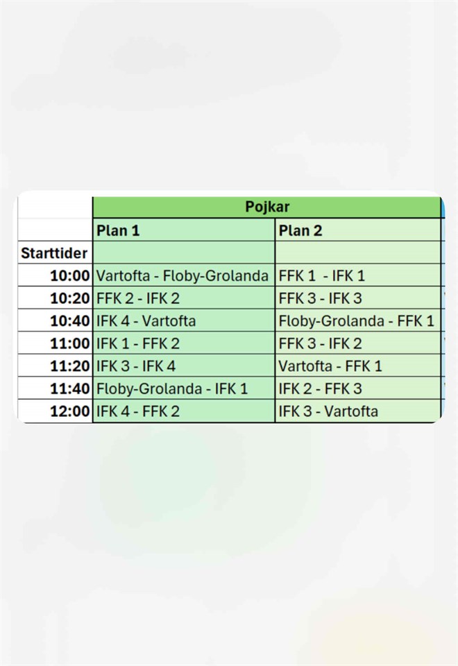 Hej, Nu på söndag 31/8 spelar vi matcher med ett lag i Skövde och ett lag i Vartofta, lagen är: Lag blå Skövde Samling på Dotorp 08:45 Valter Arham Ibrahim Marti Mohammed Suheyb Ledare Jonas Lag vit Vartofta Samling på Dotorp 15:10 Noah Filip Ali Ararat Deldar Hyab Zakarias Ledare Pontus & Richard Vilka vi spelar emot och matchtider står i kalendern. /Ledarna